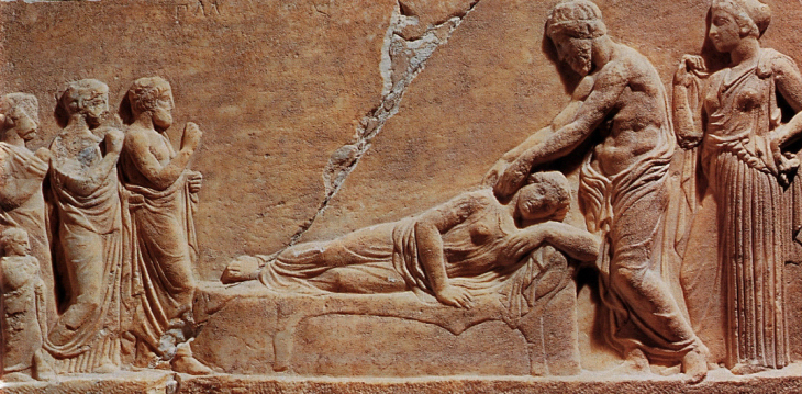 Médecin au chevet d’une malade. Bas-relief, 4e siècle avant notre ère – Musée du Pirée